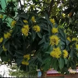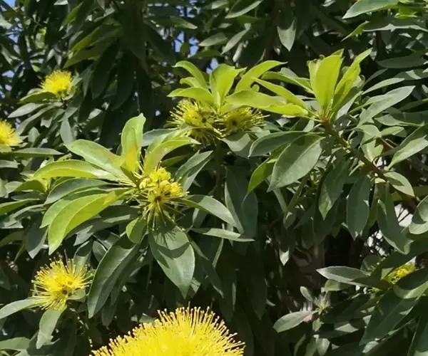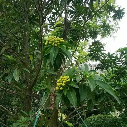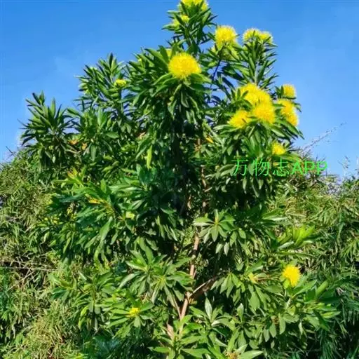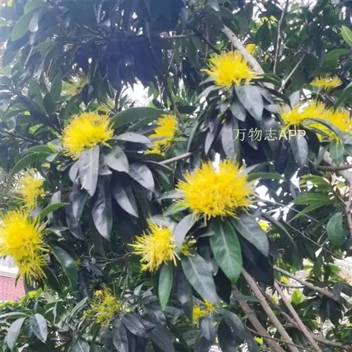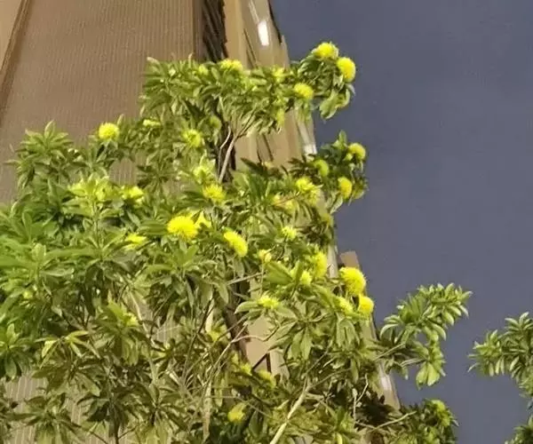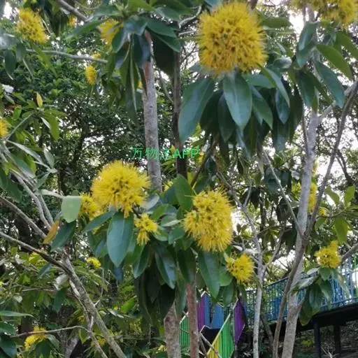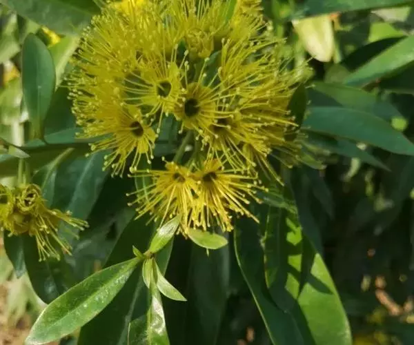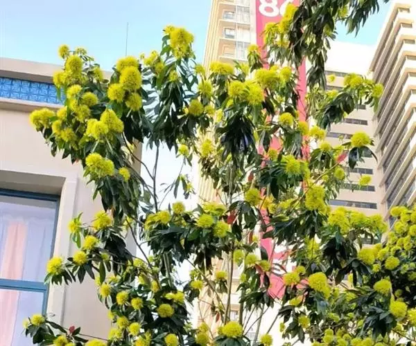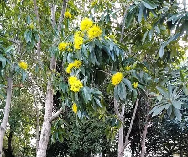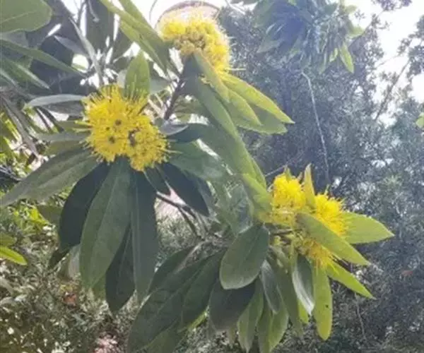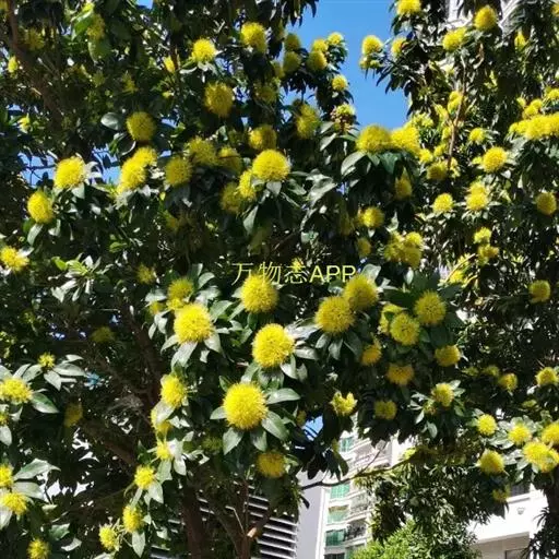 花初开时黄绿色,随着开花时间延长,转为黄色,凋谢时为金黄色,其鲜黄色的小花聚生在枝条的顶端,排成伞房花序,整团花序远观有如绒球,远看仿佛一个个憨态可掬的熊猫脸,故称为“金黄熊猫”,是花色特殊的珍奇花木。树形优美,木质坚硬,适宜作园景树木、行道树以及房前屋后等非规划林地造林,幼株可盆栽,具有较高的绿化景观和经济开发价值。