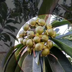 全年有花,盛花期为每年11月到次年2月,总状花序有花4-7朵,生于枝顶叶腋或苞腋,常7-13个花序组成密集的团簇状。花黄色,花萼与花瓣各5枚,倒卵形,花柱单一。开花后易结果,蒴果杯状球形,成熟时3-4裂。种子棕褐色,类三角形、肾形,扁平。