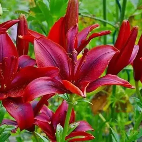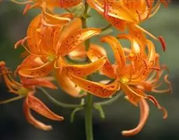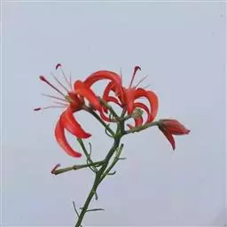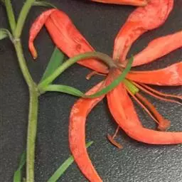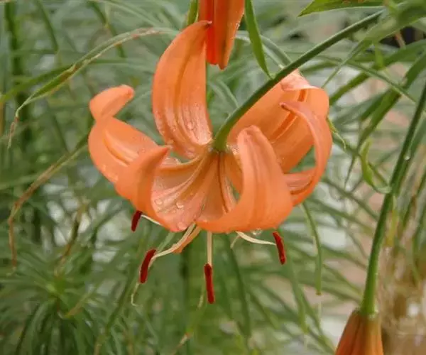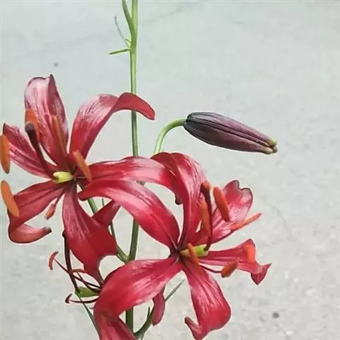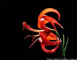 兰州百合花:花为总状花序。花色橙红,下垂。花被6片,广披针形,内面中部有多数粒状突起,排列成内外两层,互相错开。外层三片宽1.6-1.8厘米,长约6厘米,内层三片宽2.2-2.4厘米,长约18厘米。花开放后向外反卷。