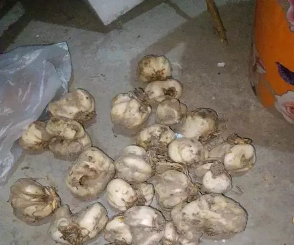 小鳞茎:二年生的鳞茎开始抽生茎秆,这时鳞片不再抽生柳叶状叶片,叶片退化为干膜状物着生在鳞片顶端。鳞茎越大,所生的茎秆越粗壮,叶片也越繁茂。