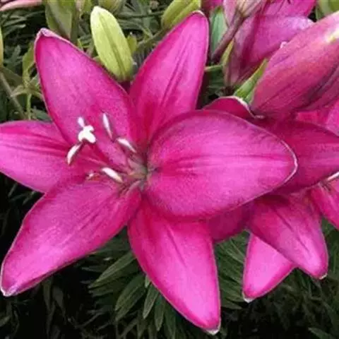 亚洲百合,百合科百合属植物。多年生草本,高30~60厘米。鳞茎卵球形。总状花序,花漏斗状,朝上开放,…
