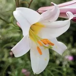 麝香百合是百合科百合属的多年生球根草本植物。鳞茎呈近球形,鳞片白色;茎高45-90厘米,绿色,…