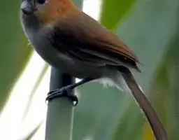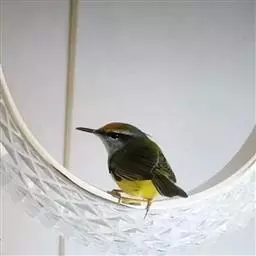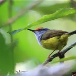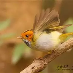 棕脸鹟莺:体长10厘米,是一种色彩亮丽而有特色的莺鸟。头栗色,具黑色侧冠纹。上体绿,腰黄色。下体白,…