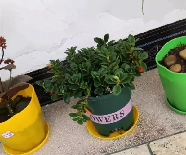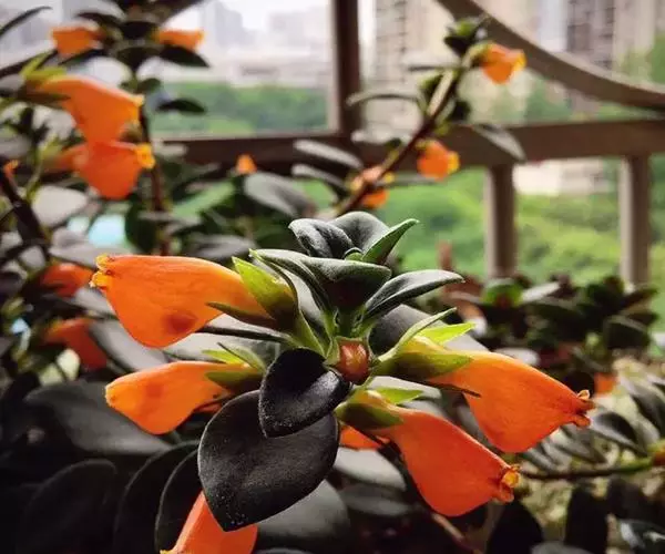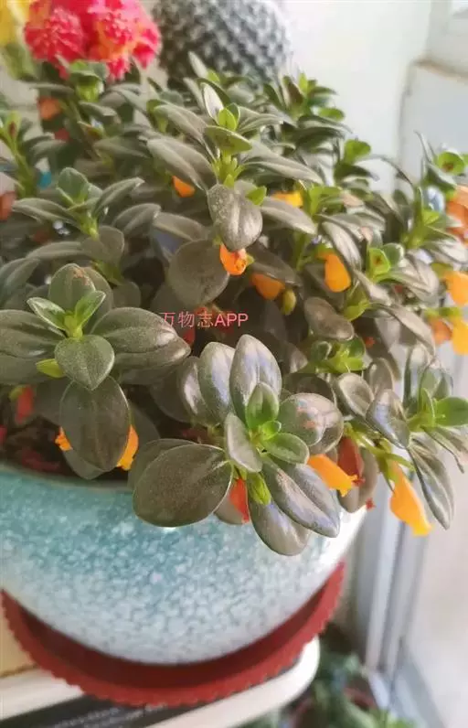 叶片呈深绿色,叶子比较厚。花橘红色,小小的嘴,大大的肚子,外形酷似金鱼。远看好像金鱼悠闲地漫游在绿色水草中间,很有趣味和韵味。