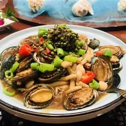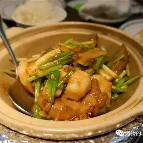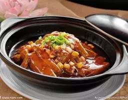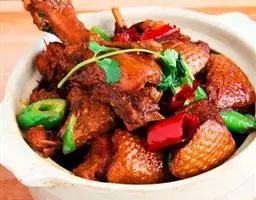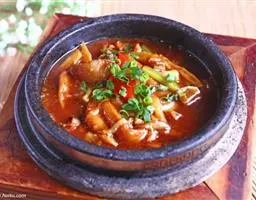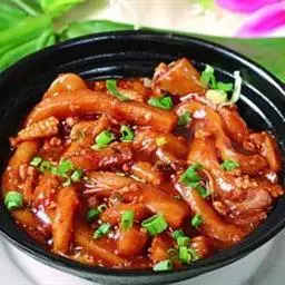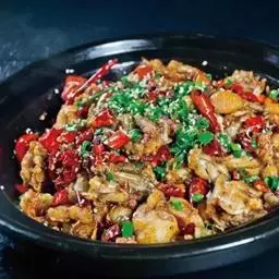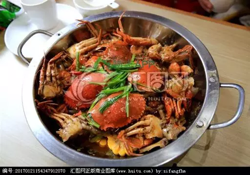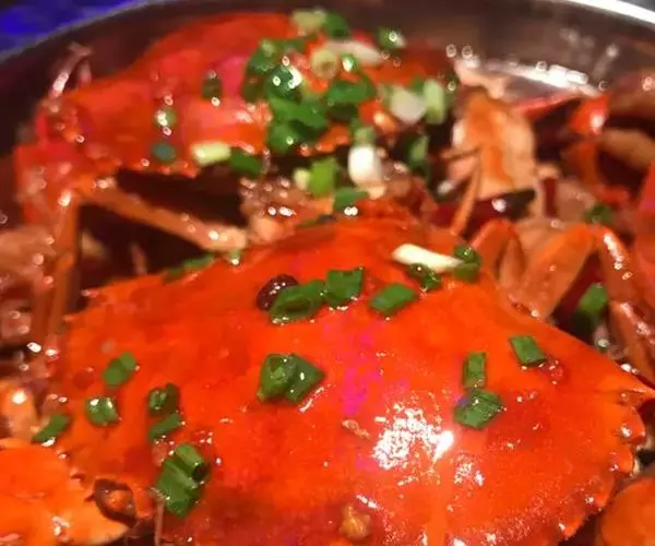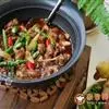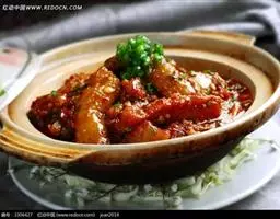 4、热锅凉油,放入少量干辣椒段、麻椒,然后放入蒜片、姜煸香,加辣酱、高汤,倒肉蟹、鸡爪翻炒收汁,装入煲盘撒香葱段即可。