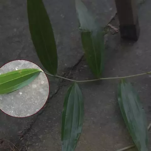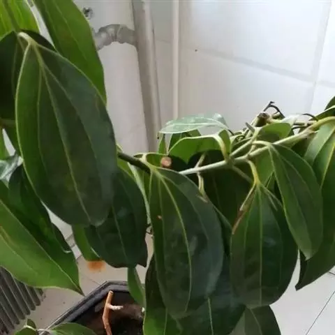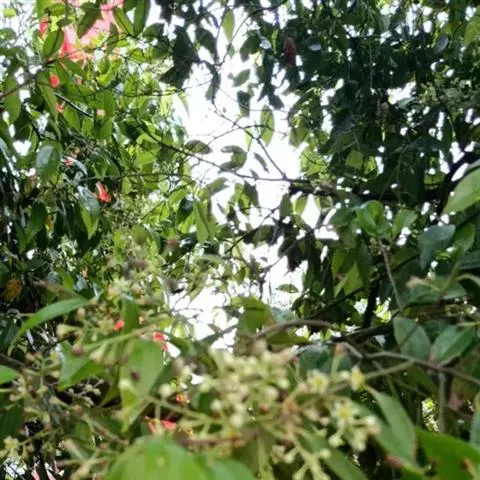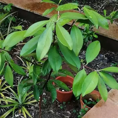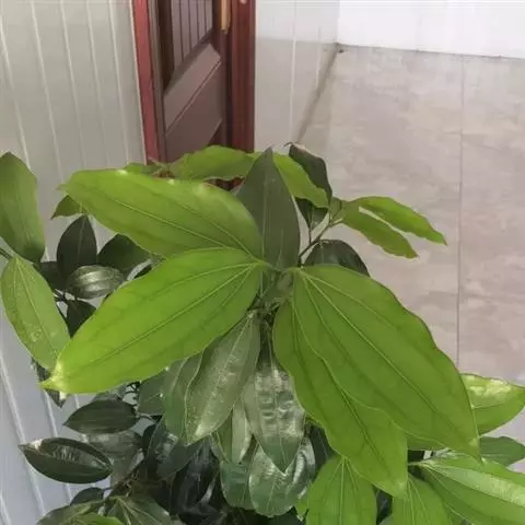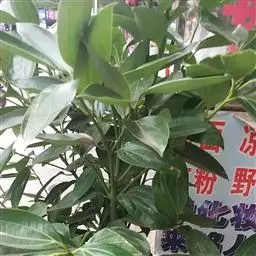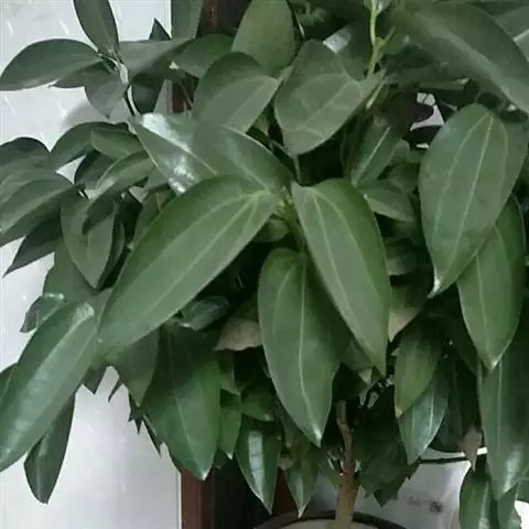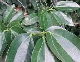 2、阴香。常绿乔木,高达20m。小枝赤褐色,无毛。叶近于对生或散生,革质,卵形或长椭圆形,长6-10cm,宽2-4cm,先端短渐尖,基部楔形至近圆形,全缘;上面绿色,有光泽,下面粉绿色,两面均无毛,具离基3出脉,脉腋内无隆起的腺体;叶柄长8-12mm。圆锥花序顶生或腋生;花小,绿白色,花被6,基部略合生,长4-5mm,两面均被柔毛;能育雄蕊9,排成3轮,外面2轮花药内向,第3轮花药外向,花药均为卵形,4室,瓣裂,花丝短,最内尚有1轮退化雄蕊;雌蕊1,子房上位,1室,1胚珠,花柱细,柱头小。浆果核果状,卵形,长不及1cm,直径约5mm,基部具肥厚杯状的宿存花被,其先端具6截形短裂片。花期3-4月。果期4-10月。