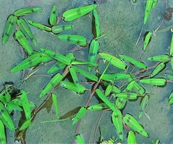 水生漂浮草本;根状茎细长,节上生羽状须根。茎露出水面的部分长约20厘米。叶鞘膨胀,具横脉;叶舌膜质,长约0.5毫米;叶片卵状披针形,长3—8厘米,宽1—2厘米,下面具小乳状突起,顶端钝,基部圆形,具短柄。