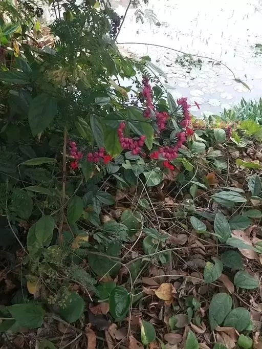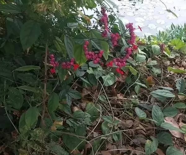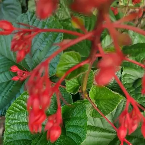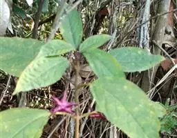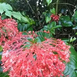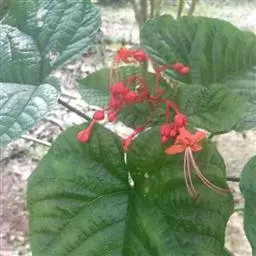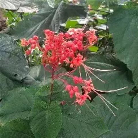 红萼龙吐珠(学名:Clerodendrum speciosum)马鞭草科大青属常绿木质藤本。叶对生,纸质,具柄,卵状椭圆形,全缘,先端渐尖,基部近圆形。聚伞花序腋生或顶生,花冠红色,花萼红色,雌雄蕊细长,突出花冠外。核果。花期春至秋末。