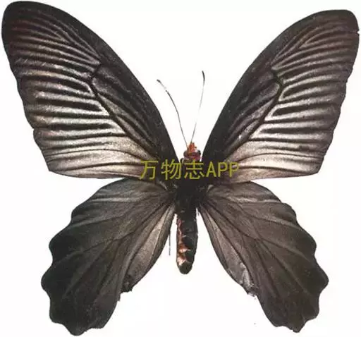 成虫:翅展115 mm左右。体背黑色,两侧红色。翅黑褐色,脉纹两侧灰色;雄蝶后翅狭窄,亚外缘有3个齿状白斑,外缘波状。雌蝶翅较阔,后翅亚外缘的白斑发达,阔而数目增加,扩展到前缘及内缘,有时这些大白斑中心有黑圆斑。翅反面色淡,白斑扩大、色淡,近前缘另有1个小白斑;其余与正面相似。雄性外生殖器上钩突上下等宽,骨化程度强;尾突长而具毛,中间膜质相连。抱器瓣宽大于长,抱器端稍窄,两侧有2个角突是抱器腹和抱器背的延伸形成的;抱器腹弧形,内突形成2个大角突。囊形突长半圆形。阳茎极粗。雌性外生殖器产卵瓣半圆形,具少数强刺;交配孔宽大,中间有舌形骨化的突起;前阴片强度骨化,两侧略呈刀片状,中部呈双马蹄形。囊导管宽短,膜质;交配囊大;囊突很长,几乎与交配囊等长,两端细柄状,中后部宽,由小突起构成有规律的褶痕。寄主 马兜铃科Aristolochiaceae的植物。