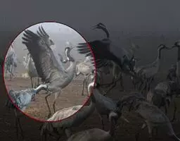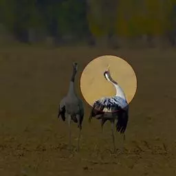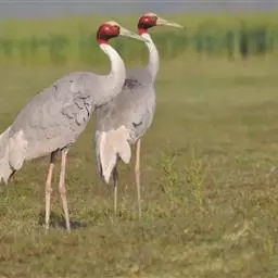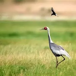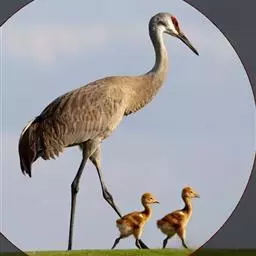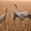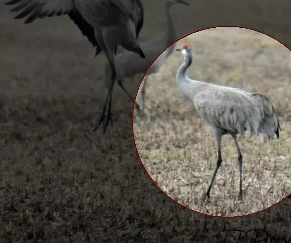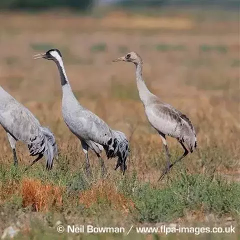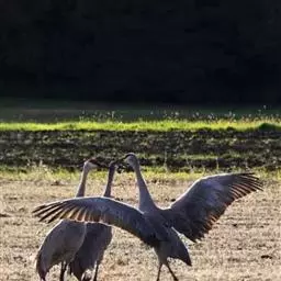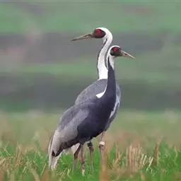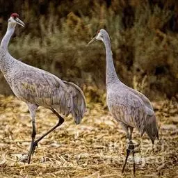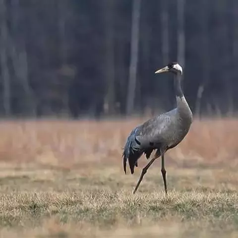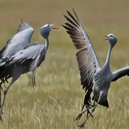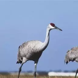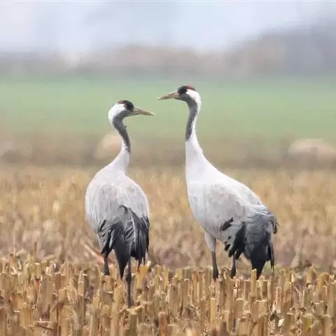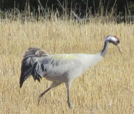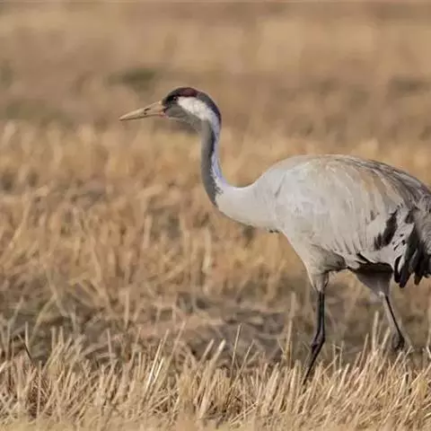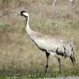 灰鹤(学名:Grus grus)是大型涉禽,体长100-120厘米。颈、脚均甚长,全身羽毛大都灰色,头顶裸出皮肤鲜红色,眼后至颈侧有一灰白色纵带,脚黑色。栖息于开阔平原、草地、沼泽、河滩、旷野、湖泊以及农田地带;其中尤为喜欢以富有水边植物的开阔湖泊和沼泽地带。主要以植物叶、茎、嫩芽、块茎、草子、玉米、谷粒、马铃薯、白菜、软体动物、昆虫、蛙、蜥蜴、鱼类等食物为食。春季于3月中下旬开始往繁殖地迁徙,秋季于9月末10月初迁往越冬地。迁徙时常为数个家族群组成的小群迁飞,有时也成40-50只的大群,繁殖期4-7月。每窝通常产卵2枚,雌雄轮流孵卵,孵化期28-30天。在世界范围内,繁殖在欧亚大陆北部;其越冬地在法国,阿拉伯半岛,非洲西北部和东北部,中东,巴基斯坦,印度以及中国的东部和南部,偶见于朝鲜半岛,日本和北美西部。越冬在非洲北部、伊朗、印度、缅甸和中南半岛北部。