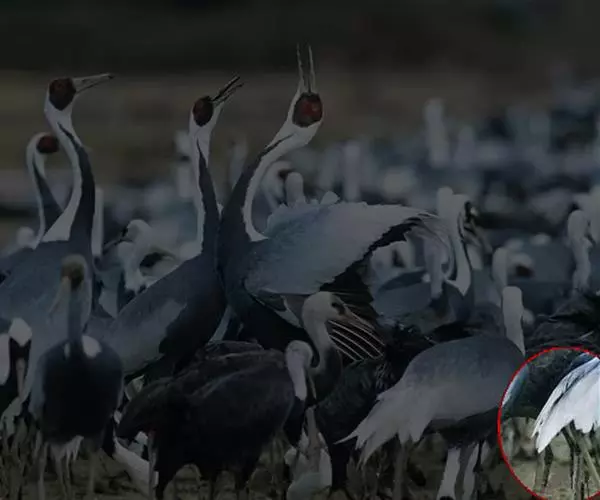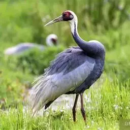 蓑羽鹤大型涉禽,体长68~92厘米,是鹤类中个体最小者。通体蓝灰色,眼先、头侧、喉和前颈黑色,…