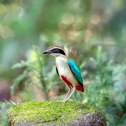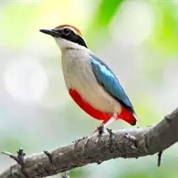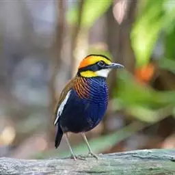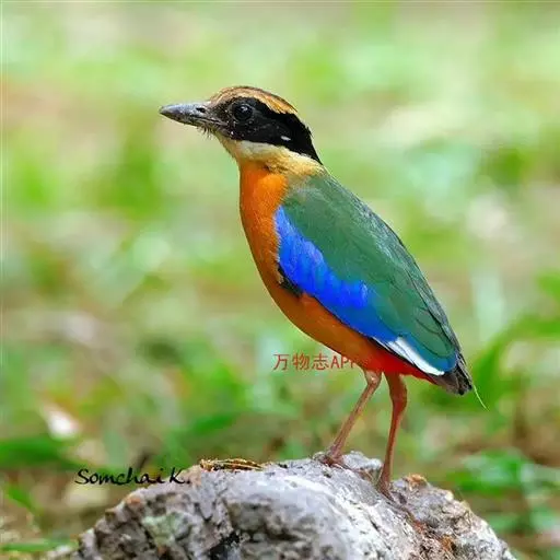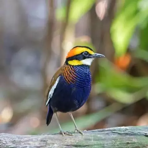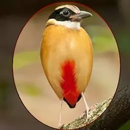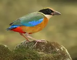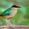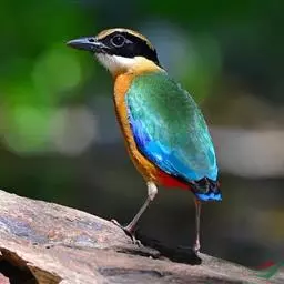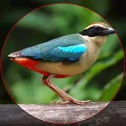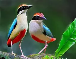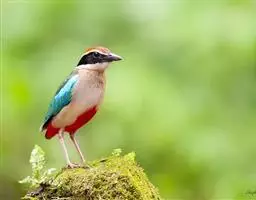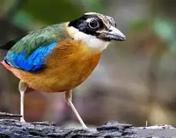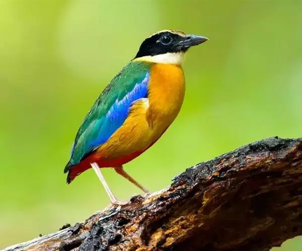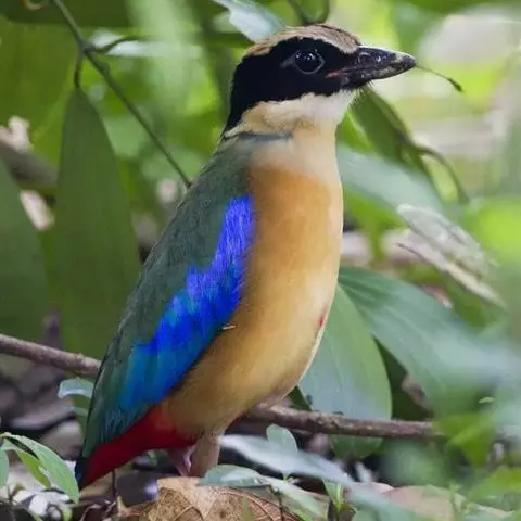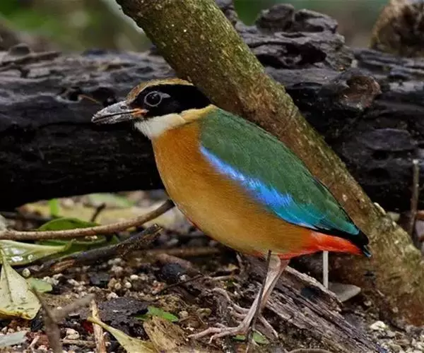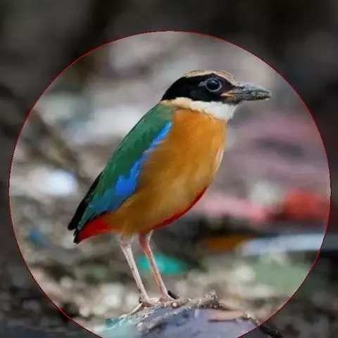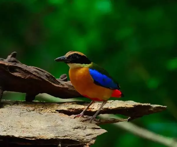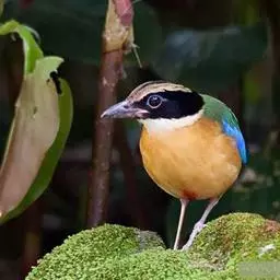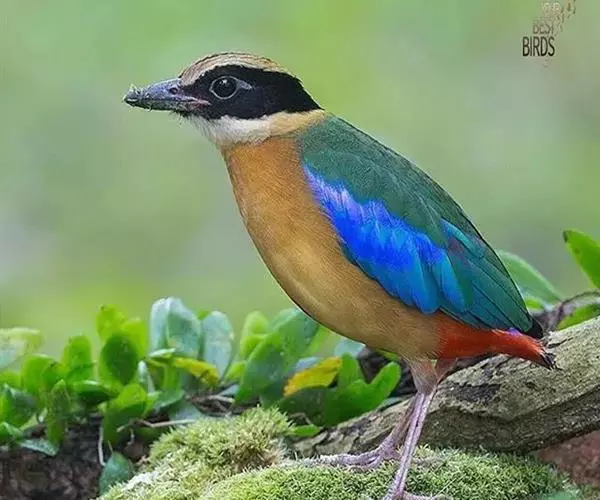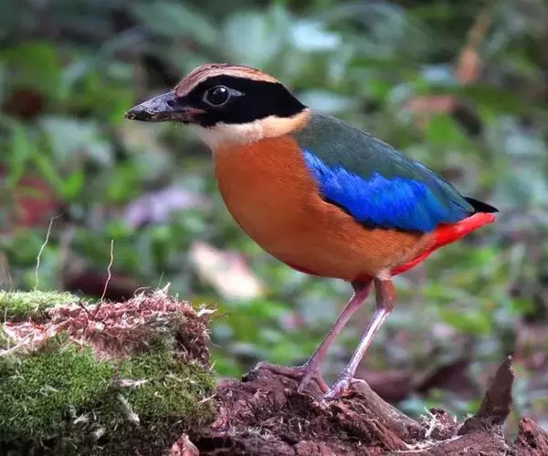 蓝翅八色鸫以身体具有红、绿、蓝、白、黑、黄、褐、栗等鲜艳夺目,丰富艳丽的色彩而得名,是很有观赏价值的鸟类。实际它身上所具有的颜色不止八种色彩,头部前额至枕部为深栗褐色,冠纹黑色,眉纹呈茶黄色,眼先、颊、耳羽和颈侧都是黑色,并与冠纹在后颈处相连,形成领斑状。背部为亮油绿色,翅膀、腰部和尾羽为亮粉蓝色。下体呈淡茶黄色,腹部中央至尾下覆羽都是猩红色。在丛林之中,它身上的这些斑斓的羽色与阳光、绿叶、紫花、白蕊等大自然的色彩融合在一起,因而也成为一种特别的保护色。