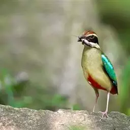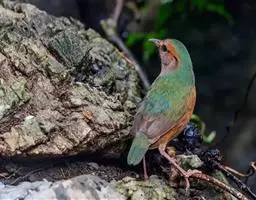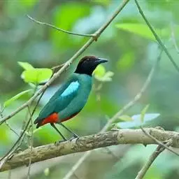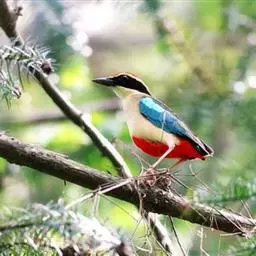 蓝翅八色鸫多见10-20只在树冠下结群静栖,或在相近的树枝上活动。喜低地灌木丛及次生林。在地面跳动似鸫鸟。多在林下荫湿处活动,是该科鸟类中分布最广的一种。在中国属夏候鸟,秋末经沿海一带迁飞至南部热带越冬。鸟鸣声是响亮清晰的笛音“tae-laew、tae-laew”,持续不到1分钟;告警时叫声为粗哑的“skyeew”声。