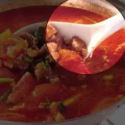 4、将牛肉汤锅置旺火上,下土豆片、莲花白片,并倒入上述焖煮的菜和汤。烧开后改小火焖至菜熟透。加入盐、糖、胡椒粉等调好口味。
