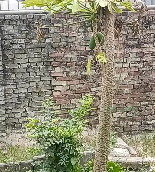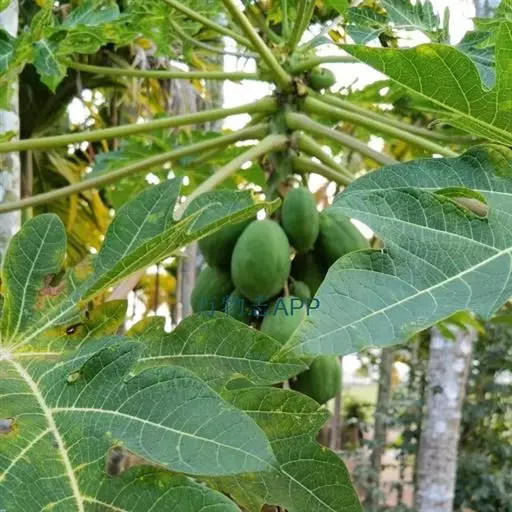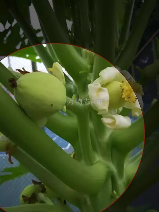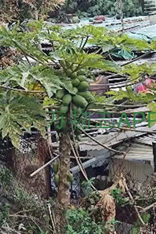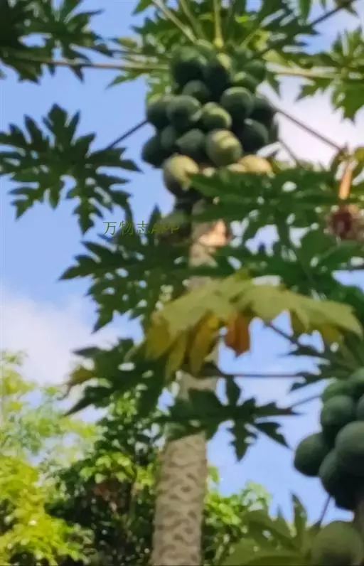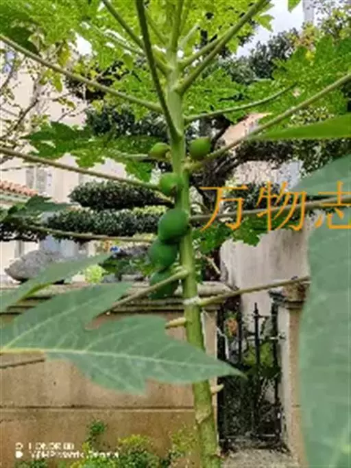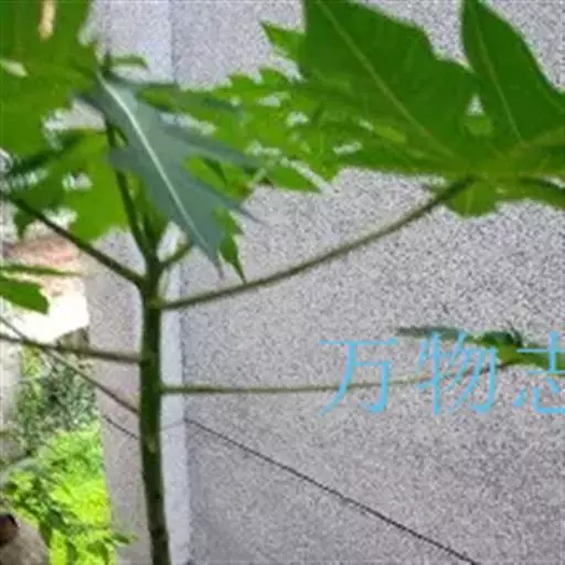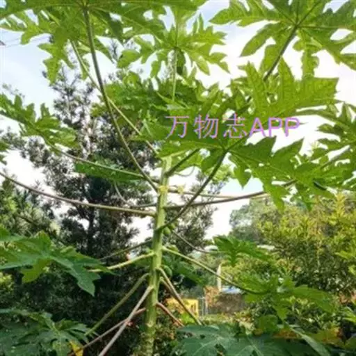 番木瓜(Carica papaya L.)又称木瓜、乳瓜、万寿果,为热带、亚热带常绿软木质小乔木,高达8-10米,具乳汁;茎不分枝或有时于损伤处分枝,具螺旋状排列的托叶痕。果实长于树上,外形像瓜,故名之木瓜。番木瓜的乳汁是制作松肉粉的主要成份。花果期全年。