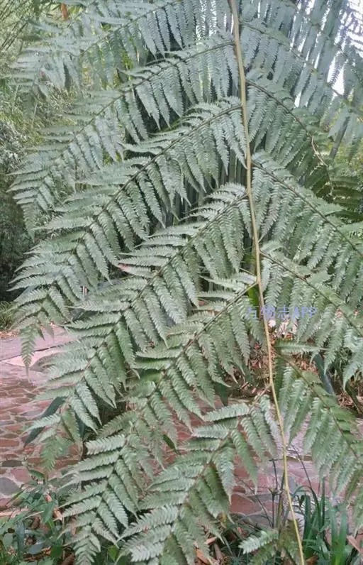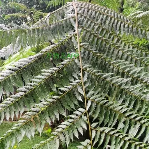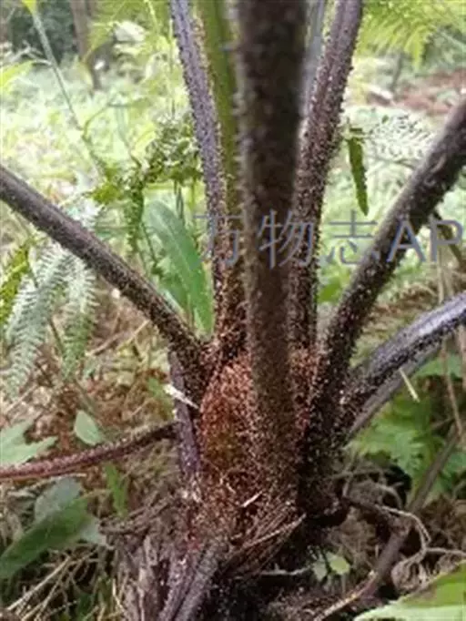 桫椤茎干高达6米或更高,直径10-20厘米,上部有残存的叶柄,向下密被交织的不定根。叶螺旋状排列于茎顶端;茎段端和拳卷叶以及叶柄的基部密被鳞片和糠秕状鳞毛,鳞片暗棕色,有光泽,狭披针形,先端呈褐棕色刚毛状,两侧有窄而色淡的啮齿状薄边;叶柄长30-50厘米,通常棕色或上面较淡,连同叶轴和羽轴有刺状突起,背面两侧各有一条不连续的皮孔线,向上延至叶轴。