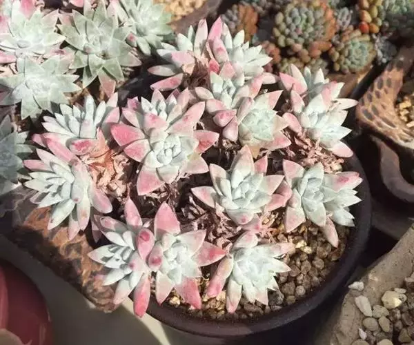 女雏是景天科石莲花属的多肉植物。特征是小巧的株形和橙粉色叶缘。极易生侧芽,…