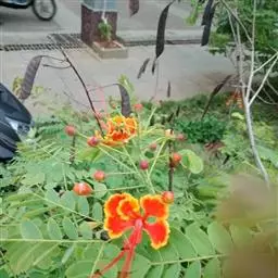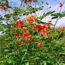 洋金凤 Sw.),豆科小凤花属灌木状或小乔木植物,枝无毛,绿或粉绿色;二回羽状复叶;总状花序伞房状,…