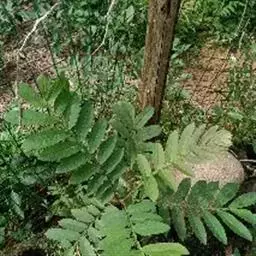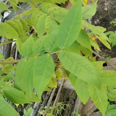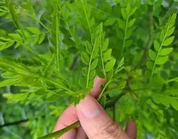 叶长30-60cm;在靠腹面的叶柄和叶轴上有二条纵棱条,有狭翅,托叶三角形;小叶6-12对,薄革质,倒卵状长圆形或长圆形,长8-15cm,宽3.5-7.5cm,顶端圆钝而有小短尖头,基部斜截形,下面叶脉明显凸起;小叶柄极短或近无柄。