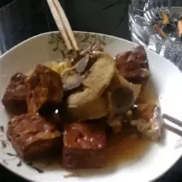 3.将排骨取出,在剩下的高汤中加入皮蛋丁和香肠丁,炖煮5分钟;