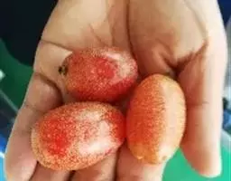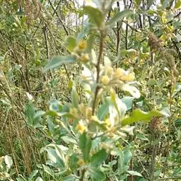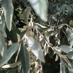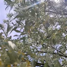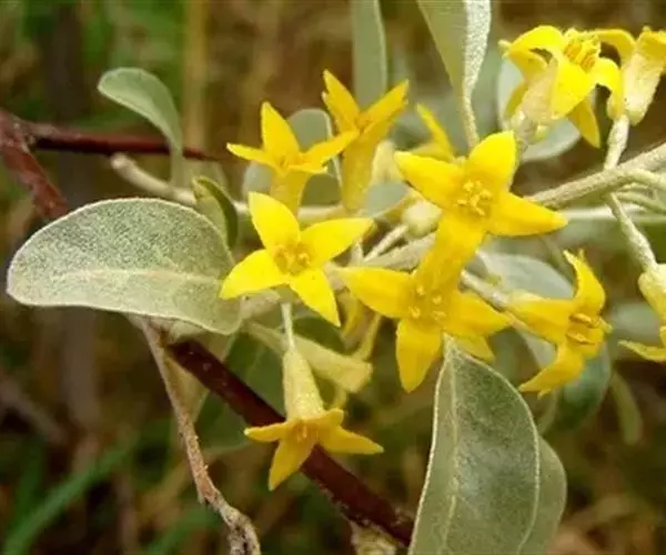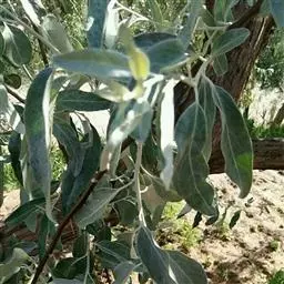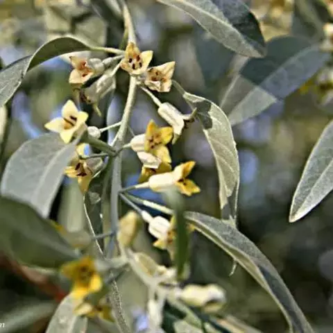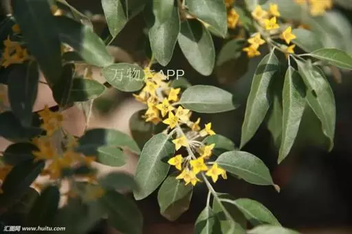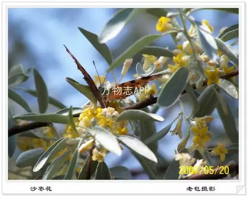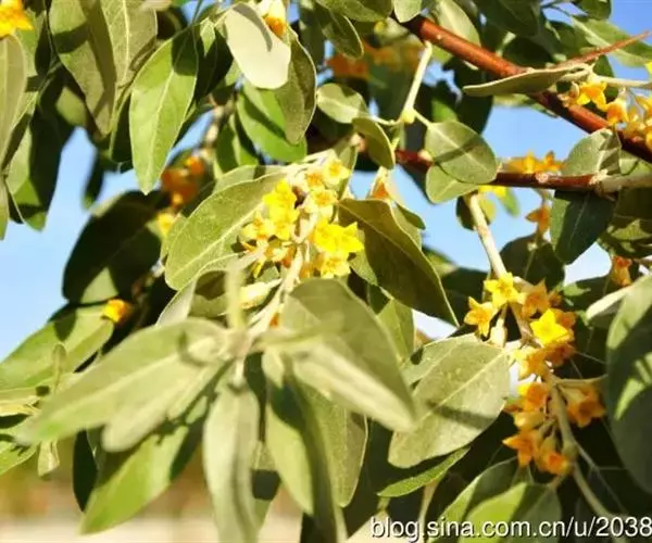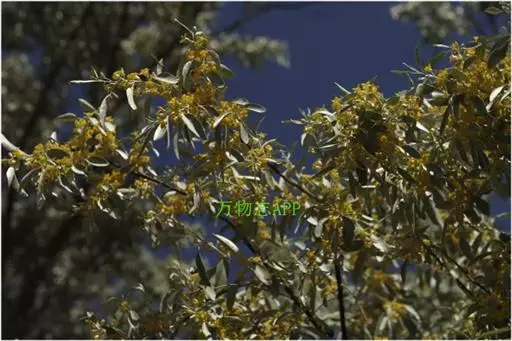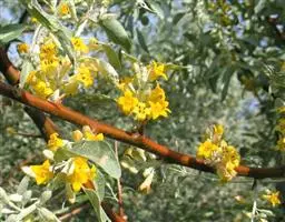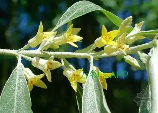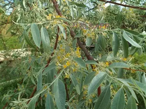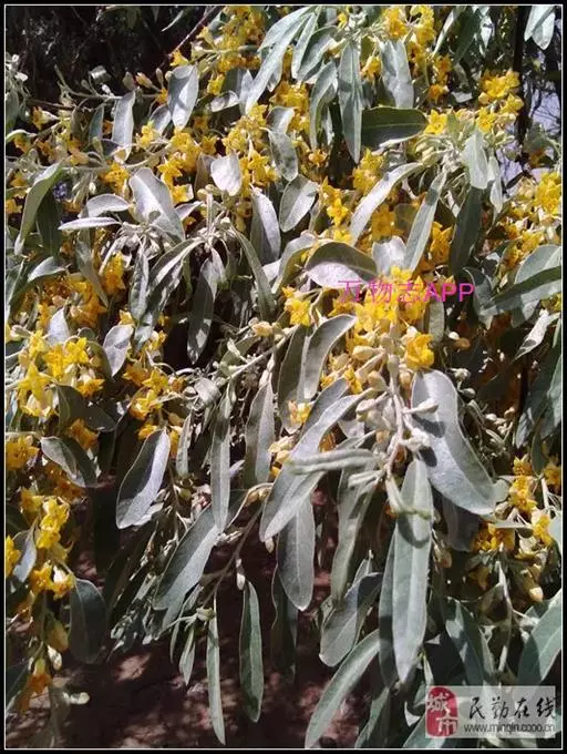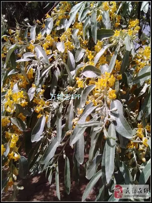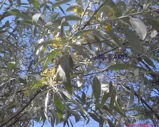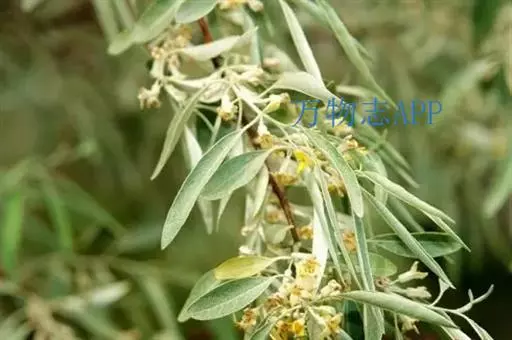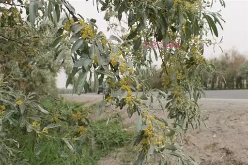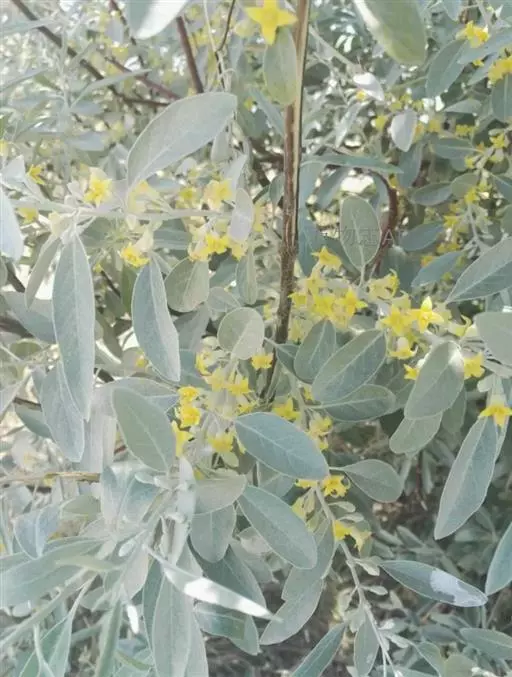 沙枣又名银柳、银柳胡颓子、桂香柳、香柳。落叶灌木或小乔木,高5-10m。枝干受伤后流出透明褐色胶汁。常具亮棕红色硬利,幼枝密被银白色鳞片,老枝鳞片脱落,栗褐色,光滑;皮孔明显,点状横裂。单叶互生,薄纸质;叶柄长0.5-1cm;叶片椭圆状披针形或披针形,长2.5-8.5cm,宽0.5-2cm,先端尖,基部楔形,全缘,上面幼时被具银白色鳞片,后部分脱落,下面银白色,有光泽,密被白色鳞片;侧脉不明显。花1-3朵生于叶腋,两性,稀单性;花被筒呈钟状或漏斗状,先端4裂,外面银白色,里面黄色,有香味;花盘先端无毛;雄蕊几无花丝;花柱长于雄蕊,先端环状弯曲。果实椭圆形,长约1.5cm,粉红色,被银白色鳞片。花期5-6月,果期9月。