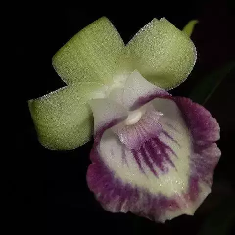 花瓣与萼片相似,常略宽于萼片;唇瓣近基部3裂;侧裂片直立,近长圆形或卵状长圆形,长3-3.5毫米,宽约3毫米;中裂片卵状椭圆形,凹陷,长8-10毫米,宽6-7毫米,先端急尖,边缘近全缘并多少内卷,内面常有4-6条紫红色的纵脊,纵脊皱波状;距粗大,长5-8毫米,宽4-5毫米,末端浑圆;蕊柱粗短,长6-7毫米。花期8-9月。
