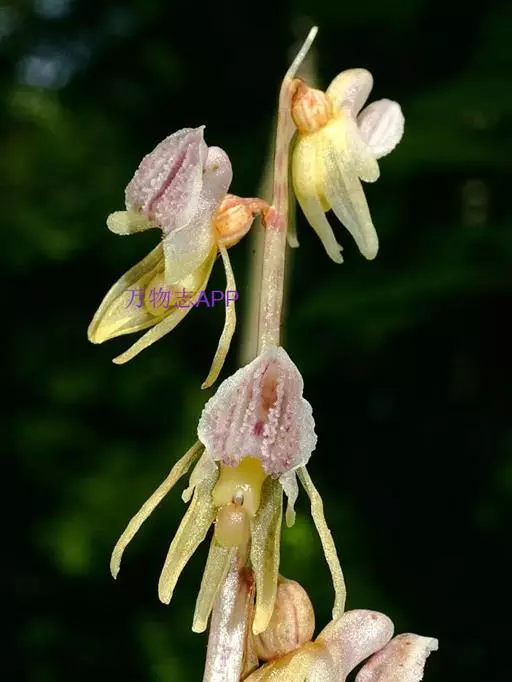 裂唇虎舌兰(学名:Epipogium aphyllum (F. W. Schmidt) Sw.):植株高10-30厘米,地下具分枝的、珊瑚状的根状茎。茎直立,淡褐色,肉质,无绿叶,具数枚膜质鞘;鞘抱茎。总状花序顶生,具2-6朵花;花黄色而带粉红色或淡紫色晕,多少下垂;萼片披针形或狭长圆状披针形,花瓣与萼片相似,常略宽于萼片;唇瓣近基部3裂。花期8-9月。