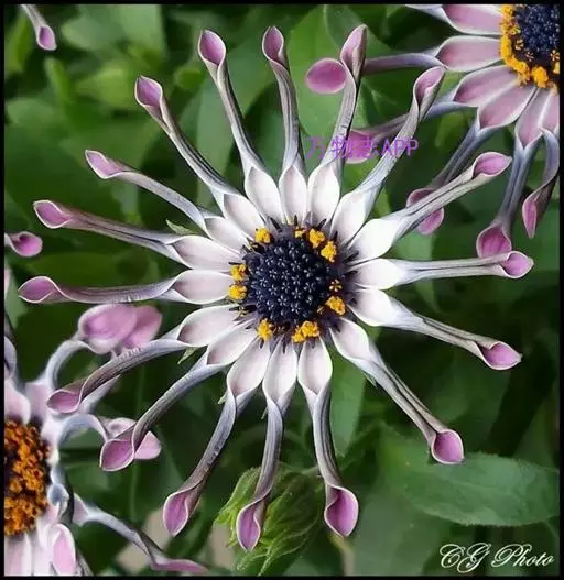 经常会和南非万寿菊混淆,区别是 1、蓝目菊的叶子通常羽状分裂,而南非万寿菊(蓝眼睛)一般不分裂。2、花朵 蓝目菊的花心,即所谓管状花部分,只有蓝色,南非万寿菊(蓝眼睛)有蓝色、黄色及紫色,一般说来,在蓝目菊属中,耐寒性的种类则会在中央呈深蓝色;缘花部分(舌状花),蓝目菊只有白色一种,而南非万寿菊(蓝眼睛)多呈紫、粉、白、黄等色。