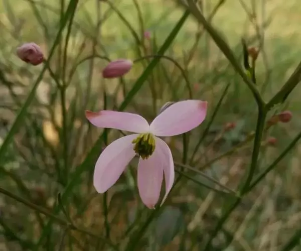 植株全部无毛。茎高11-78厘米,上部分枝或不分枝。基生叶2-6,长5-18厘米,为二至四回三出复叶;叶片长2.5-10厘米;小叶薄革质,钻状狭线形或狭线形,长0.6-3厘米,宽0.5-1.5毫米,顶端尖,边缘常反卷,中脉隆起;叶柄长1.5-9厘米,基部有短鞘。茎生叶2-4,似基生叶,渐变小。聚伞花序伞房状;花梗细,长2-4.5厘米;萼片4,粉红色或白色,椭圆形或狭倒卵形,长6-10毫米,宽3-5毫米;雄蕊长2.8-3毫米,花药长圆形,长约2毫米,有短尖,花丝短,丝形;心皮7-11,无柄,花柱短,腹面生柱头组织。瘦果纺锤形,长3.5-4.5毫米,粗约1.2毫米,有8-10条纵肋。6-7月开花。
