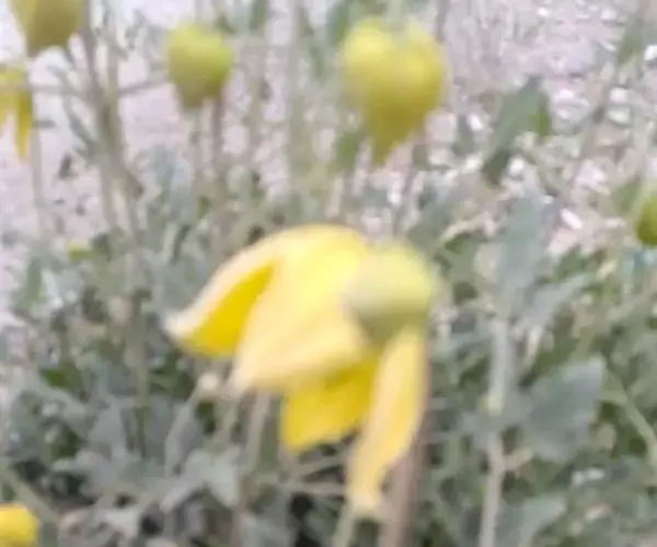 花单生,有时为单聚伞花序,有3花,腋生;花序梗粗壮,长(4.5-)6-15(-20)厘米,有柔毛;萼片4,黄色外面带紫色,斜上展,狭卵形、椭圆状长圆形,长1.5-2.5(-3.5)厘米,顶端渐尖或急尖,外面边缘有短绒毛,中间被柔毛,内面无毛,或近无毛;花丝下面稍扁平,被开展的柔毛,花药无毛; 子房密生柔毛。