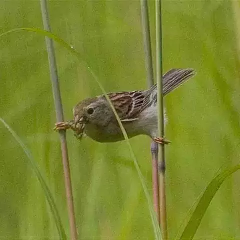 繁殖期常有的鸣叫声为单调、规则、重复的尖高音调类似“dzeep-dzeep”或“zit-zit-zit-”,此单音可持续近三分钟。飞行或停栖小草枝头时,均会鸣唱,在飞行时每叫一单音正好配合一次振翅的波状起伏。