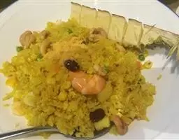 在新鲜菠萝横面1/4之一处切开,挖出菠萝肉,将隔夜的冷饭拌上蛋黄,炒至饭与蛋黄变干之后放入菠萝壳内,撒上适量芝士粉以增强香味;菠萝肉切成丁,加上鸡丁、虾仁,一起填入菠萝壳中,将整个菠萝放进烤炉焗上5-6分钟,菠萝的甜香挟卷着饭香扑鼻而来,迎面更是丰盛的视觉享受,每一勺饭都浸染了菠萝汁,甜中微酸,让人胃口大开。