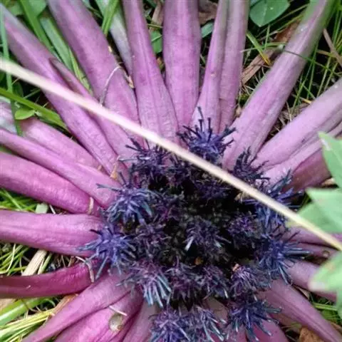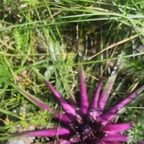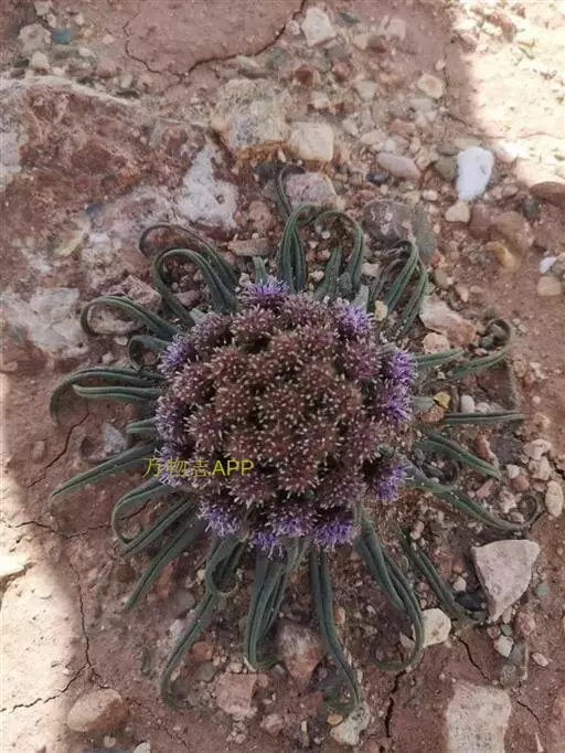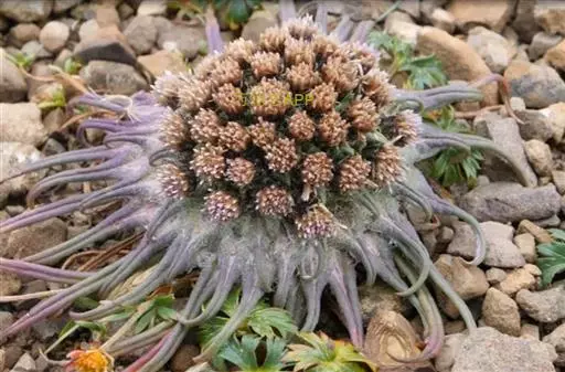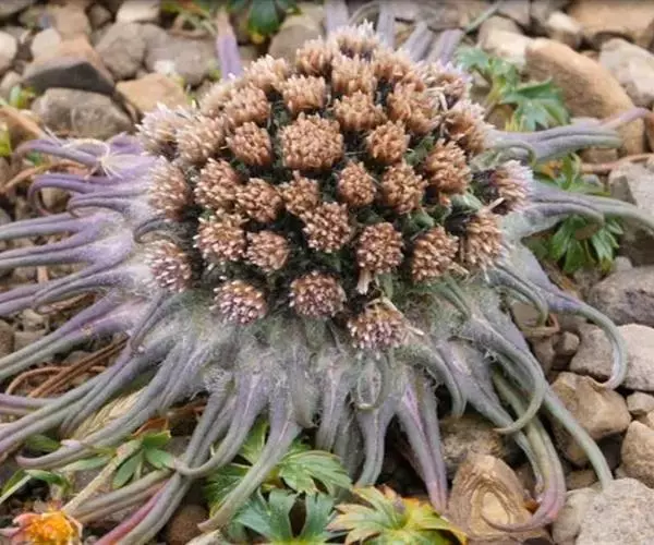头状花序无小花梗或有长近2毫米的小花梗,多数在莲座状叶丛中密集成半球形的直径为4厘米的总花序。总苞圆柱状,直径6毫米;总苞片5层,外层长椭圆形或长圆形,长7毫米,宽4毫米,顶端急尖,紫红色,外面密被白色长柔毛,中层长圆形,长1.2厘米,宽2.5毫米,顶端圆形,内层长披针形,长9毫米,宽2毫米,顶端渐尖,外面无毛。小花紫红色,长1厘米,细管部与檐部各长5毫米。