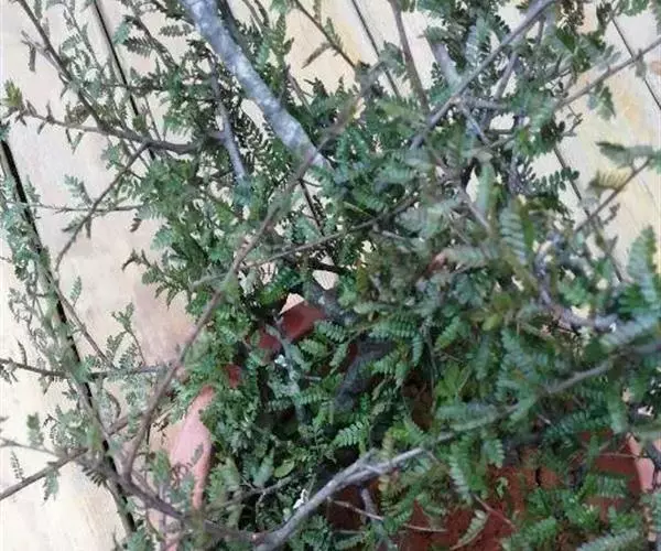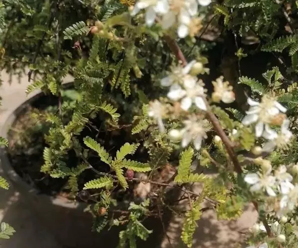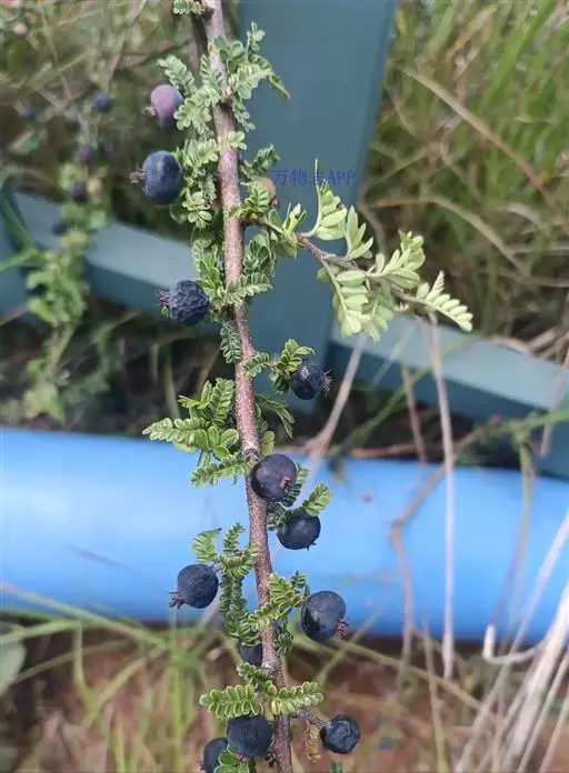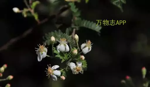 落叶或半常绿灌木,高1-3m。小枝细弱微弯,红褐色或紫褐色,幼时密被灰白色柔毛,后渐脱落,多年生枝黑褐色。奇数羽状复叶,互生,具小叶片7-15 对,连叶柄长2-4.5cm,幼时被绒毛;托叶披针形,有柔毛,早落;小叶片对生,椭圆形、椭圆状长圆形或倒卵状长圆形,长5-10mm,宽2-4mm, 先端急尖或突尖,基部宽楔形或近圆形,全缘,两面均疏被柔毛,下面较密,小叶柄极短;叶轴上有窄叶翼。花两性;顶生伞房花序,有花3-5朵,直径 2-3cm;总花梗和花梗均密被灰白色柔毛;苞片线状披针形,早落;萼筒钟状;萼片5,与萼筒近等长,外面有柔毛;花瓣5,长圆形,白色;雄蕊20;花柱5,基部被长柔毛,柱头头状。梨果卵形或近球形,直径6-8mm,蓝黑色,萼片宿存反折;小核5,骨质,表面粗糙。花期4-5月,果期7月。