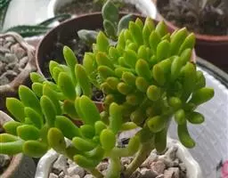 玉米石是景天科、景天属植物。多年生草本多浆植物。植株低矮丛生,多分枝。叶膨大成圆筒形、卵形或近小球形,…