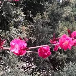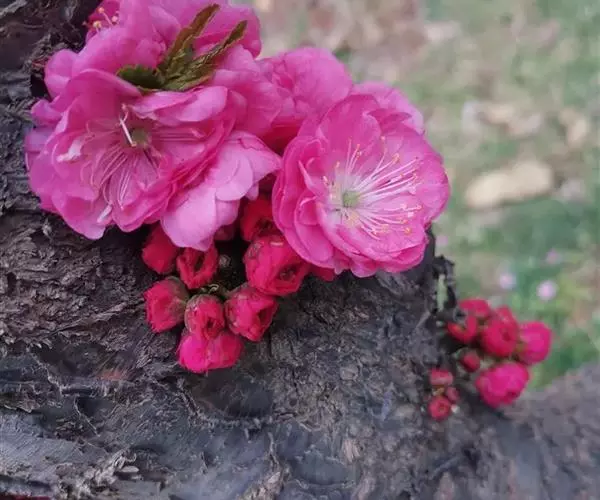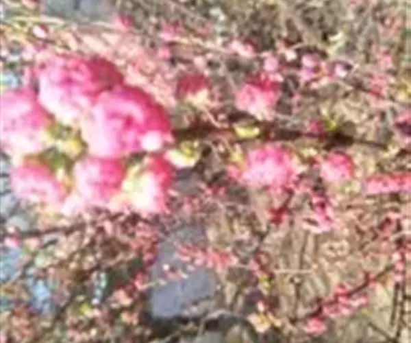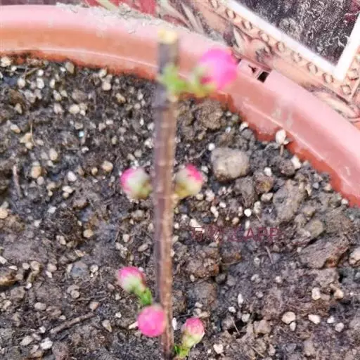 (4)鸾枝榆叶梅:花朵小,密集生在枝上,花色呈玫瑰紫红,半重瓣或重瓣,花菩10片,其5片为三角形,5片为披针形。植株小枝呈紫红色,光滑.