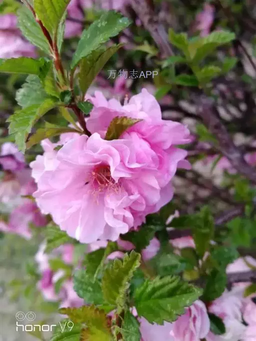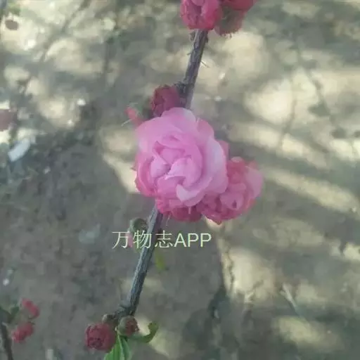 落叶灌木,是榆叶梅的一个变种或变型,稀为小乔木,株高2-5米。枝条开展,具多数短小枝;小枝灰色,一年生枝灰褐色,嫩枝无毛或微被毛,冬芽短小,长2-3毫米。短枝上的叶常簇生,一年生枝上的叶互生;叶宽卵形到倒卵形,长2-6厘米,宽1.5-3(4)厘米,先端少分裂,常3裂,基部宽楔型,边缘具粗重锯齿上面疏被毛或无毛,下面短柔毛。叶柄长5-8毫米,有短毛。花重瓣,花1-2朵,先于叶开放,直径2-3厘米;花梗长4-8毫米;深粉红色,萼筒呈广钟状,长3-5毫米,微被毛或无毛,萼片卵圆形或卵状三角形,无毛,近先端疏生有细锯齿,雄蕊20,子房密被短绒毛,花瓣近圆形或宽倒卵形,长6-10毫米,先端圆钝,有时微凹,粉红色;雌蕊约25-30,短于花瓣;子房密被短柔毛,花柱稍长于雄蕊。子房下位;核果,近球形,红色,壳面有皱纹,直径1-1.8厘米,顶端具短小尖头,外被短柔毛;果梗长5-10毫米;果肉薄,成熟时开裂;核近球形,具厚硬壳,直径1-1.6厘米,两侧几不压扁,顶端圆钝,表面具不整齐的网纹。花期3-4月,果期5-6月。