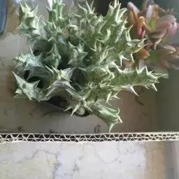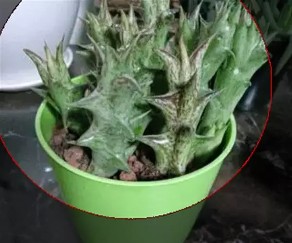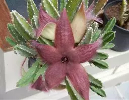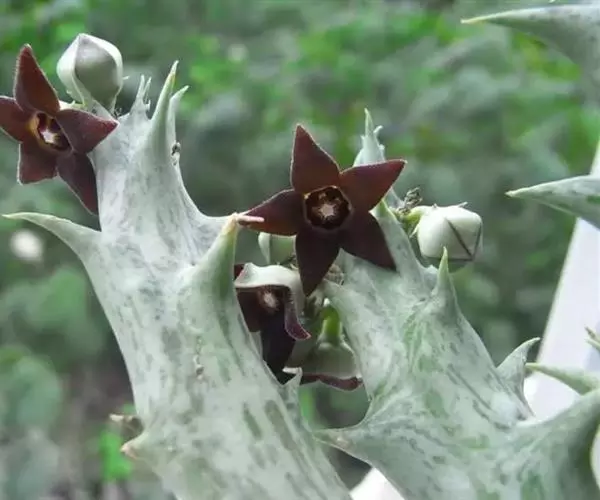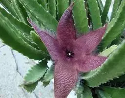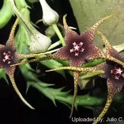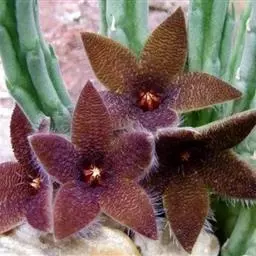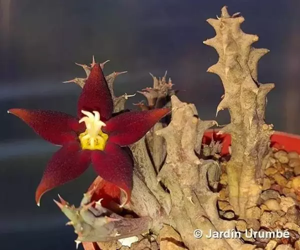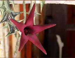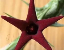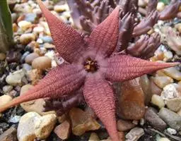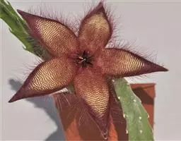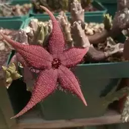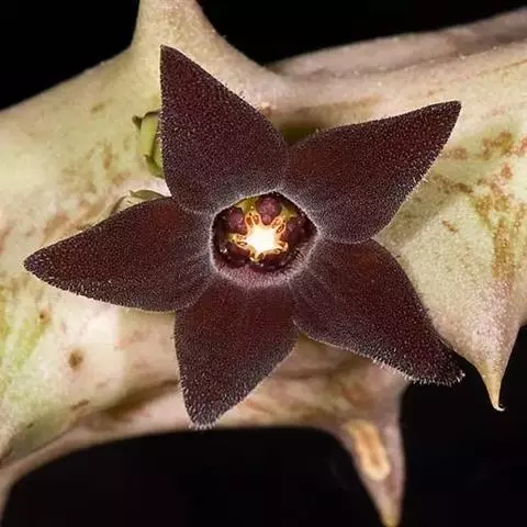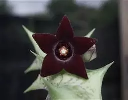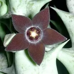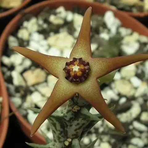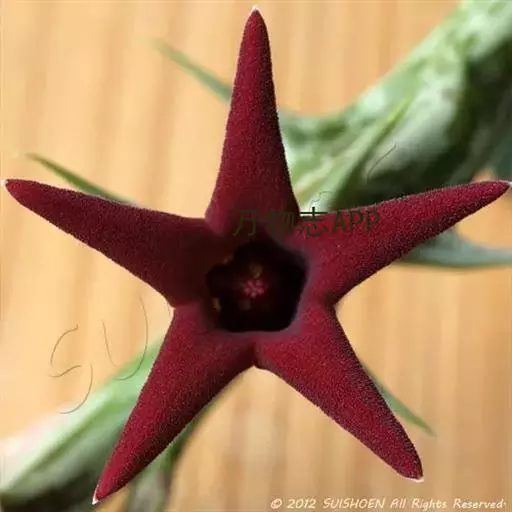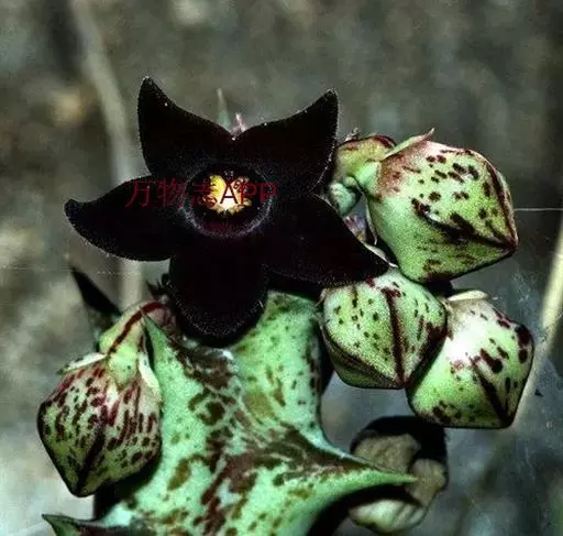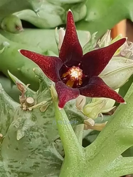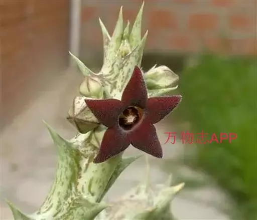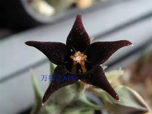 紫龙角,多年生肉质草本,植株灰绿色,表面长有紫褐色斑纹,棱缘波 状,有齿状突起。看起来好像很硬,但摸起来却软软的。植株低矮,分枝多,开深褐红色星状的花,花星状,深褐红色,被白色浓毛,花有臭味,会吸引苍蝇。