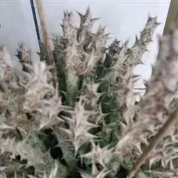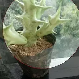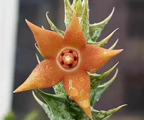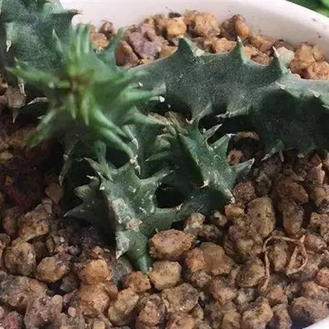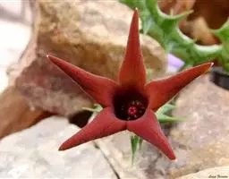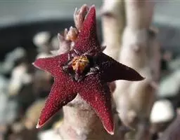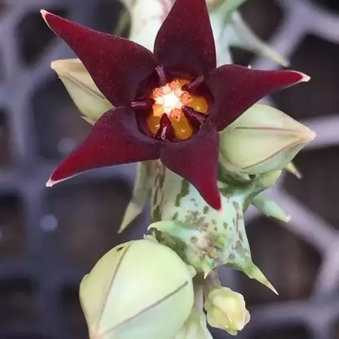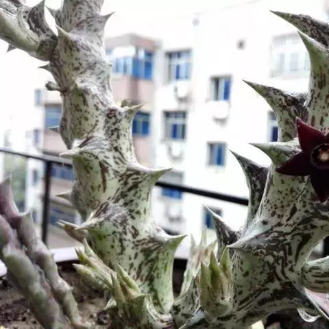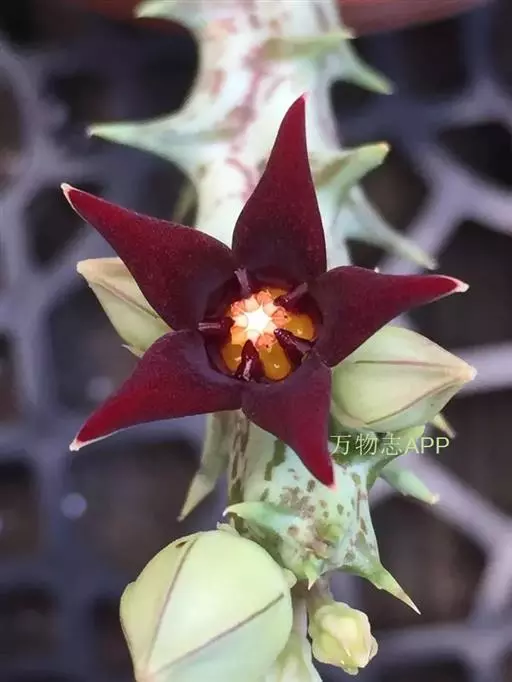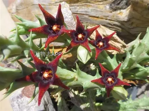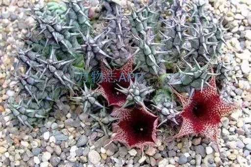 紫龙角(Caralluma hesperidum)萝藦科水牛掌属(水牛角属),分布于北非、地中海地区和南也门的索科特拉岛,又名水牛角。开出的花很招苍蝇。多年生肉质草本,植株灰绿色,表面长有紫褐色斑纹。看起来好像很硬,但摸起来却软软的。植株低矮,分枝多,开深褐红色星状的花,花有臭味,会吸引苍蝇,所以很少有人在养。