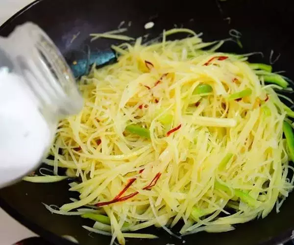 2.炒锅注油烧热,下葱,姜丝爆锅,下入三丝翻炒,加味精,精盐炒匀,淋香醋出锅即可。