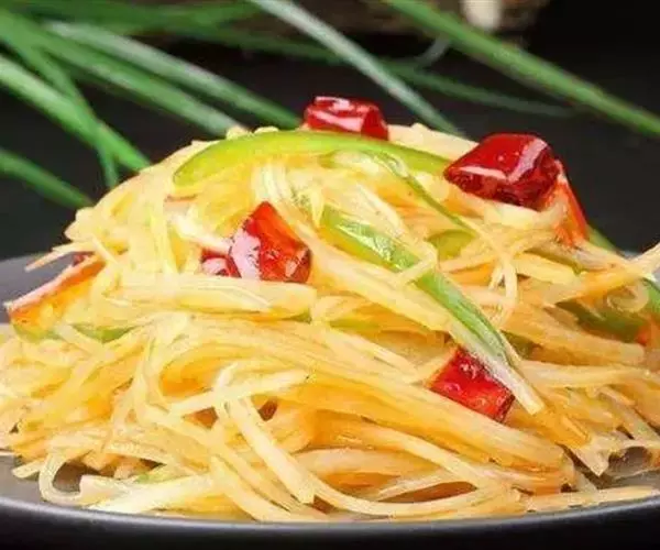 醋熘三丝是以土豆、青椒等为主要食材制作的美食。