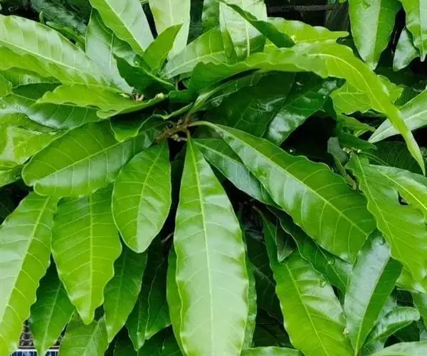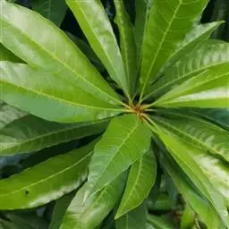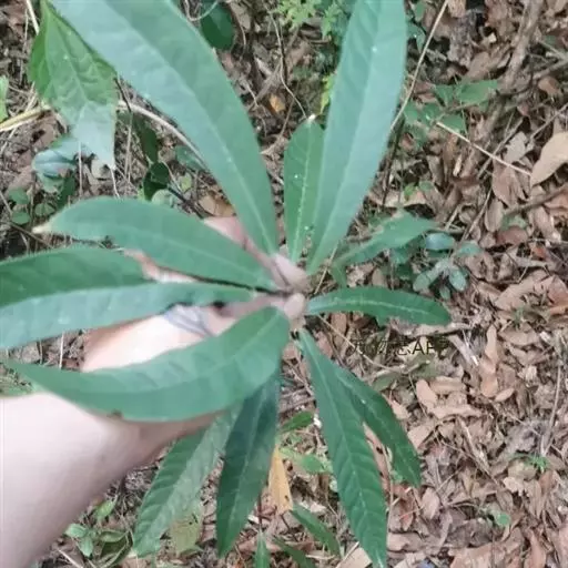 蛋黄果 小乔木,高约6m;小枝圆柱形,灰褐色,嫩枝被褐色短绒毛。叶坚纸质,狭椭圆形,长10-15(20)cm,宽2.5-3.5 (4.5)cm,先端渐尖,基部楔形,两面无毛,中脉在上面微凸,下面浑圆且十分凸起,侧脉13-16对,斜上升至叶缘弧曲上升,两面均明显,第三次脉呈网状,两面均明显;叶柄长1-2cm。