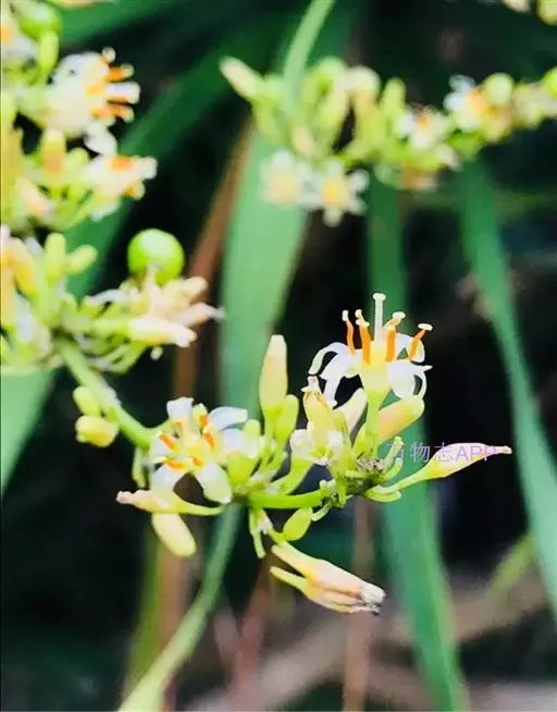 圆锥花序长在30厘米以上;花序轴无毛或近无毛;花每3-7朵簇生,绿白色或淡黄色;花梗长5-7毫米,关节位于上部1/3处;花被片长6-7毫米,下部约1/4-1/5合生成短筒;花丝扁平,宽约0.5毫米,无红棕色疣点;花药长约1.2 毫米;花柱稍短于子房。浆果直径约1厘米。花期7月。