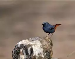 赭红尾鸲:小型鸟类,体长13-16厘米。雄鸟前额、头侧、颈侧、颏至胸概黑色,头顶和背灰色或黑色,…