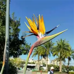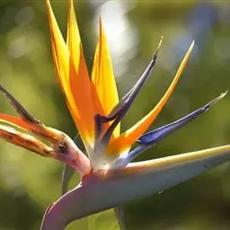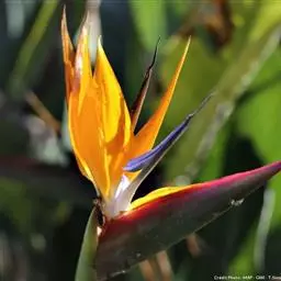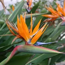 鹤望兰,别名天堂鸟,为鹤望兰科鹤望兰属的一种多年生草本植物;无木质树干;花序生于与叶柄近等长或稍短的花序梗上,佛焰苞1;花较小,萼片橙黄色,长7.5-10厘米,箭头状花瓣基部具耳状裂片,暗蓝色;花期在冬季。该物种原产非洲南部,在中国南方大城市的公园、花圃有栽培,北方则为温室栽培。性喜温暖湿润、阳光充足的气候,适宜生长的温度为25℃左右,耐干旱、较耐寒、不耐水湿,要求疏松肥沃、排水良好,以土层深厚的沙壤土为宜。因花形美丽似鹤,花开时犹如仙鹤翘首远望,花朵寿命亦长,故中文名为鹤望兰。鹤望兰素有“鲜切花之王”的美誉,是一种名贵的观赏花卉,深受广大消费者喜爱。同时,鹤望兰也宜大盆栽植,布置在公园、客厅、会议室、展厅候机室等处。鹤望兰是美国洛杉矶市的官方花卉象征。