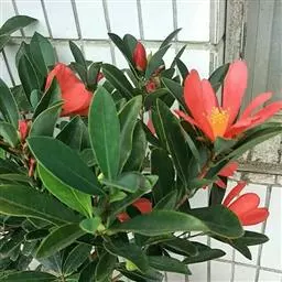 滇山茶:灌木至小乔木,有时高达15米,嫩枝无毛。叶阔椭圆形,上面干后深绿色,发亮,下面深褐色,无毛,…