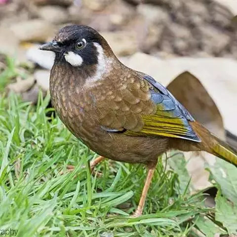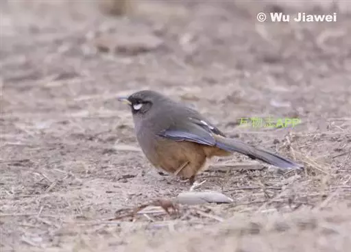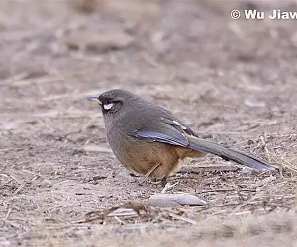 中等体型(28厘米)的酒灰褐色噪鹛。脸颊及耳羽明显为白色,上下各有黑褐色条纹与烟褐色的眼先相接。外侧尾羽混灰色而端白。三级飞羽羽端白。尾上覆羽棕色,臀暖皮黄色。