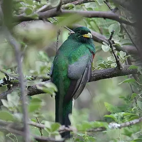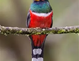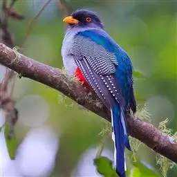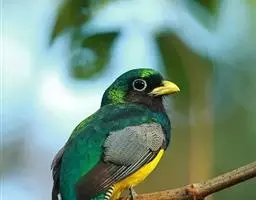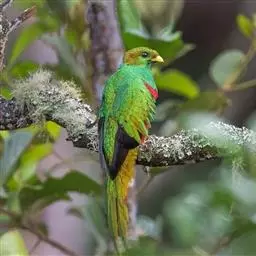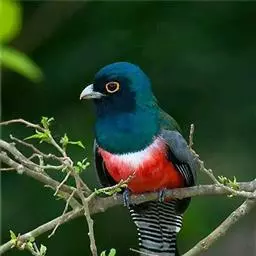 橙胸咬鹃(学名:Harpactes oreskios):全长约28厘米。雄鸟头、颈橄榄绿色,上体及中央尾羽栗色;中央尾羽具黑色端,其外侧的2对尾羽黑色,最外3对尾羽基部黑色具白端;翼覆羽有密的黑、白相间横,飞羽黑褐;颏、喉橄榄色,胸橄榄黄,下体余部橙黄色。嘴铅色,脚黄褐色。雌鸟羽色似雄鸟,但上体羽色较暗,翼覆羽具黑、棕相间横斑。