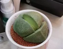 每单生植株基部有6-8枚叶片,放射状排列;叶高度肉质,柔软,长3-5厘米,宽0.6-1厘米;倒三棱线形,正面平坦,背部具以龙骨状凸起;叶对生,基部合生,呈白色,先端逐渐变细;表皮光滑,绿色至墨绿色,密布透明小斑点。