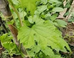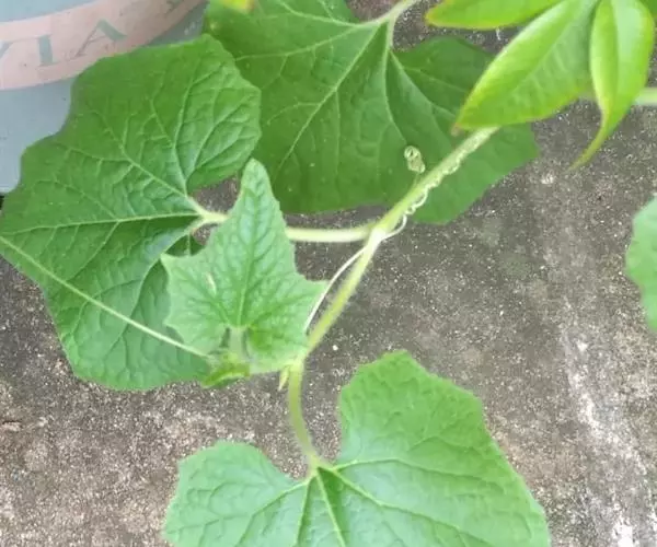 一年生蔓生或架生草本;茎被黄褐色硬毛及长柔毛,有棱沟。叶柄粗壮,长5-20厘米,被黄褐色的硬毛和长柔毛;叶片肾状近圆形,宽15-30厘米,5-7浅裂或有时中裂,裂片宽三角形或卵形,先端急尖,边缘有小齿,基部深心形,弯缺张开,近圆形,深、宽均为2.5-3.5厘米,表面深绿色,稍粗糙,有疏柔毛,老后渐脱落,变近无毛;背面粗糙,灰白色,有粗硬毛,叶脉在叶背面稍隆起,密被毛。卷须2-3歧,被粗硬毛和长柔毛。